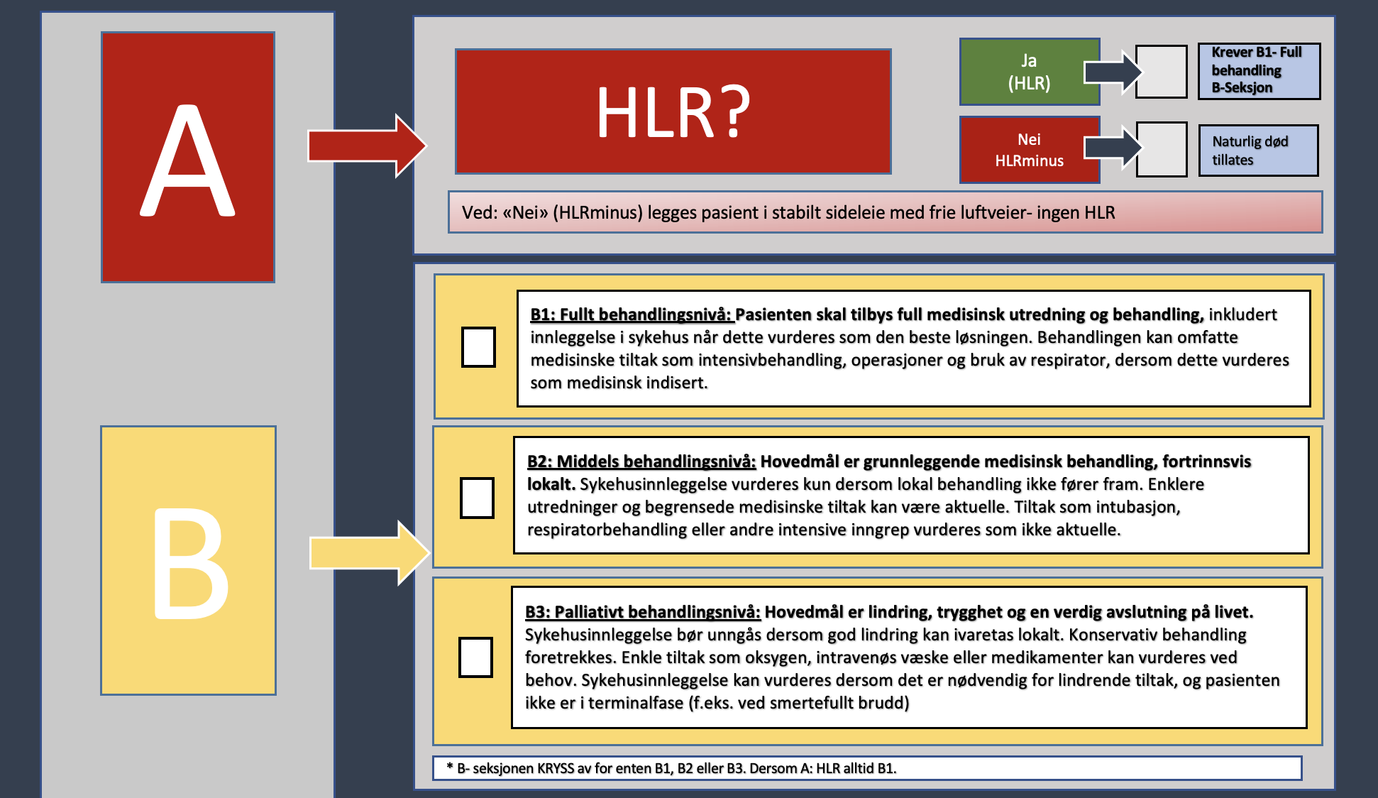 A- seksjonen handler om det skal gjennomføres Hjerte og lungeredning (Dersom man velger «JA» i A-seksjonen skal man alltid velge B1 (fullt behandlingsnivå i B-seksjonen)