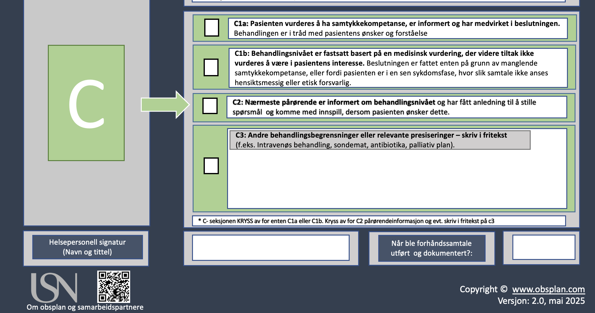 C-seksjonen handler om i hvilke grad pasienten har vært med på avgjørelsen, eller om den er fattet på bakgrunn av en medisinsk vurdering med manglende samtykkekompetanse. Kryss av for enten c1a eller c1b. C2 må krysses ut for å vise at pårørende har fått informasjon.